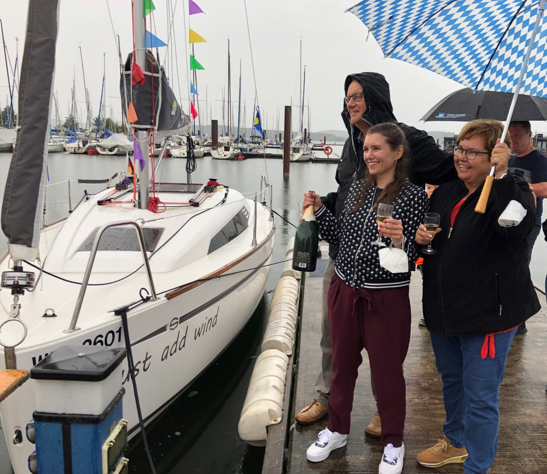 Ein neues Segelboot am WAB Steg, eine Sunbeam 22.1, wurde auf "just add wind" getauft, mit ausreichend Wasser von oben. Im Anschluss wurde dieses freudige Ereignis noch gebührend gefeiert und fand mit einem wunderschönen Regenbogen über dem Brombachsee einen unvergesslichen Abschluss.